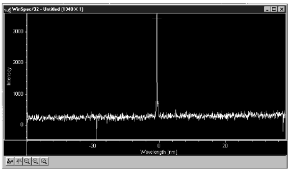 分光器は、リファレンス波長へ動き、スペクトルを測定します。ピーク検出を行い、取得したデータを表示します。リファレンスピークは、おおよそディスプレイの真中に現れ、カーソルはピーク、ないしは最も強度のあるそばに現れるでしょう。