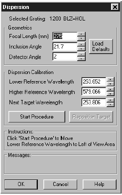 Dispersionボタンを押してDispersion ダイアログボックスを開いてください。もし、以前にDispersion計算をした事がなければ、Defaultボタンを押して下さい。これにより、Focal Length, Inclusion Angle, and Detector Angleの標準値を与えます。もし、以前にDispersion計算を行っていて、それが確かなら、それをスターティング値とします。