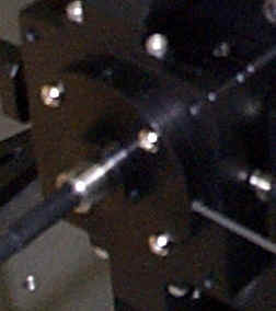 このファイバーを分光器のスリット前のXYマウントに取り付けます。取り付け方向に注意して下さい。出口がスリット状になった方に、付属の下図のような治具を通し、XYマウントに差し込みます。スリットにぶつかるまで差し込んだら、この治具のイモネジを止めます。