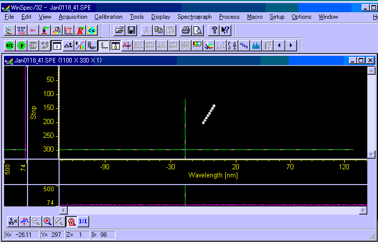 最初に回転をあわせます。WinSpecをFOCUSモードで走らせ、像を見ながら、ファイバーを回転させます。この時、ファイバーの像付近だけをROI設定(Imaging mode)した方が確認しやすいでしょう。ファイバーが、縦に1直線になるように調整して下さい。