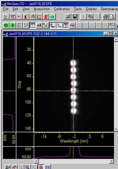 まず、分光器のスリットをいっぱいにあけ、中心波長を0nmとします(0次光を見ます)。室内光で適当な強度で画像が見えるようなパラメータを設定して下さい。CCDのフォーカスがきちんと合っていれば、下のように、ファイバーの1本1本が分離されて、像として見えるはずです。